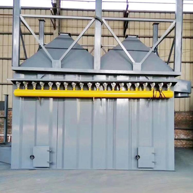 含尘气体在进风口进入除尘器箱体内,细小尘粒由于布袋的多种效应作用下,被滞阻在布袋的外壁。净化后的气体通过布袋上箱体出风口排出。随着使用时间的增长,布袋表面吸附的粉尘增多,布袋的透气性会有程度的减弱,使除尘器阻力不断增大。为保证除尘器的阻力控制在限定的范围之内,由脉冲控制仪发出信号,循序打开电磁脉冲阀,使气包内的压缩空气由喷吹管各喷孔喷射到对应的文氏管(称为一次风),并在高速气流将通过文氏管时诱导数倍于一次风的周围空气(称为二次风)进入滤筒,造成布袋间急剧膨胀,由于反向脉冲气流的冲击作用很快消失,布袋又急剧收缩,这样使积附在布袋外壁上的粉尘被清理,落下的灰尘进入灰库。
