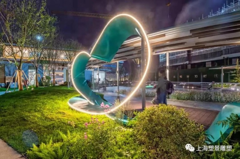 在夕阳西下、薄雾弥漫、绿带映绕、空灵之境,廊架如星辰流动的光影,动感现代,飘带如彩练舞动,柔软新潮,历时月余的制作安装,新工艺的加持,使极简的造型创作出新精致主义。