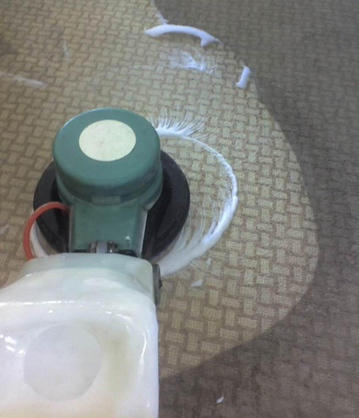 5、干泡刷洗:用装有水器、地毯刷的单盘扫地机,以干泡刷洗地毯。等清洁剂对地毯产生作用一会后,在重复刷洗工作。