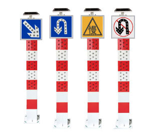 太阳能交通警示柱顶部可配:标志牌配有:右侧行驶、禁止掉头标志、掉头标志、限速标志等、文字配四字警示语:注意安全、车辆慢行、严管区域、单向行驶等均可定制、