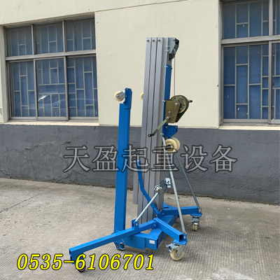 1、手摇式铝合金升降机铝合金材质,结构坚固,体积小自重轻,作业省力
