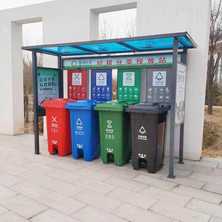 目前,生活垃圾分类收集是城市生活垃圾处置的主流趋势,有利于提升垃圾清运效率,便于再生资源的回收利用,减少环境污染。垃圾分类亭,分为地基基础设施、宣传栏、立柱、顶棚等,亭内设置可回收、有害垃圾、厨房垃圾和其他垃圾等垃圾桶,垃圾桶及宣传栏配有垃圾分类的宣传标语,广大群众可以根据垃圾桶的提示标语,将废弃的生活垃圾投放到对应的垃圾桶中。
