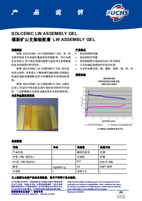 性能概述 福斯SOLCENIC LW ASSEMBLY GEL 是一种 水溶性的富含各种高性能添加剂的装配膏,可以为液 压支架的 U 型卡锁定的液压胶管与连接接头的装配提 供良好的润滑和防锈保护。 福斯SOLCENIC LW ASSEMBLY GEL 具有良 好的水溶性,非常适合于新的液压油缸装配或维修后 的液压油缸重新装配过程中的静密封和动密封的润滑。 福斯 SOLCENIC LW ASSEMBLY GEL 与液压 支架工作过程中用的乳化液有很好的相容性和可溶 性,不会影响液压支架的过滤系统和支架控制系统。 |