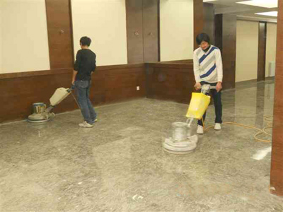 6、水晶处理:经过以上工艺之后,就可以进行水晶处理了,我们用的是西班牙水晶加硬剂,加光剂按照其使用工艺说明,通过设备加压,低速打磨,使剂品产生热化反应,使地面形成防滑的坚硬镜面。