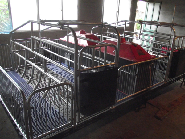 母猪产床,主体采用热浸锌管或喷漆管焊接,使其结构 合理,经济实惠,质量和寿命大幅提高,成为各大规模化养猪厂的 ,仔猪塑料地板,母猪球墨铸铁地板,扁钢大梁支撑。含母猪食槽,仔猪圆形补料槽,保温箱,电热板。