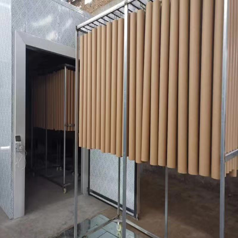纸管烘干房分为上下通风式和左右通风式两种方式,加热方式分为电烘干和气烘干,热风内循环。房体具有保温性能。