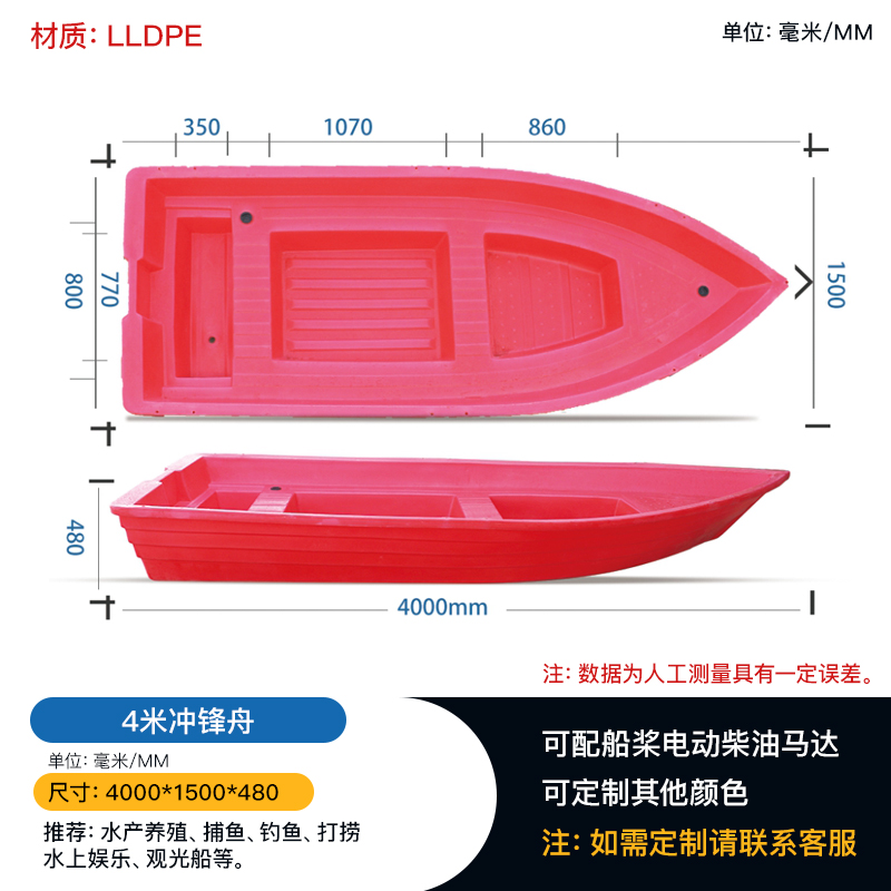 赛普4米塑料冲锋舟,以全新LLDPE为原料,滚塑一次成型。产品采用双层结构设计,使用更加牢固安全。耐各种水质侵蚀,表面光滑,清洗方便。船体相较于传统木质渔船,轻巧方便,两个人即能轻松抬起。船体表面采用防滑设计,使用更安全可靠。冲锋舟可配船桨,也可装电动马达,行驶起来更加轻松省力。船头设计成尖头,有利于船体前进,在救灾和救护中起到关键作用。
