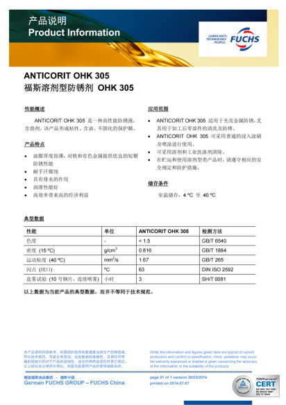 性能概述 ANTICORIT OHK 305是一种高性能防锈液, 含溶剂。该产品形成粘性、含油、不固化的保护膜。 |