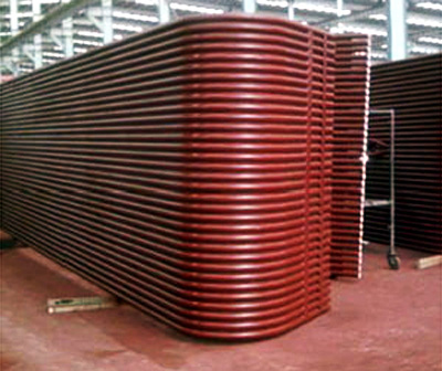 1、当分段的管排吊放到组合架上之后,要对管排的宽度、长度、平整度及对角线进行检查和调整。如管排宽度大于或小于规定尺寸时,可将鳍片割开适当的长度,调整到规定尺寸后再重新焊好。管排对角线差值超过lOmm时,可割开尺寸偏大一端部分管子间的鳍片,使管距缩小至能消除对角线差值后,再将鳍片焊好。管排不平整度超过允许范围时,可采用龙门架利用千斤顶顶压校正。