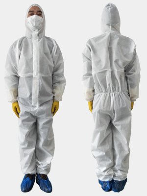 02)隔离衣的款式由帽子-上衣-裤子三连体组成,采用材质是75克SMS无纺布,有蓝色和白色等多种颜色。
