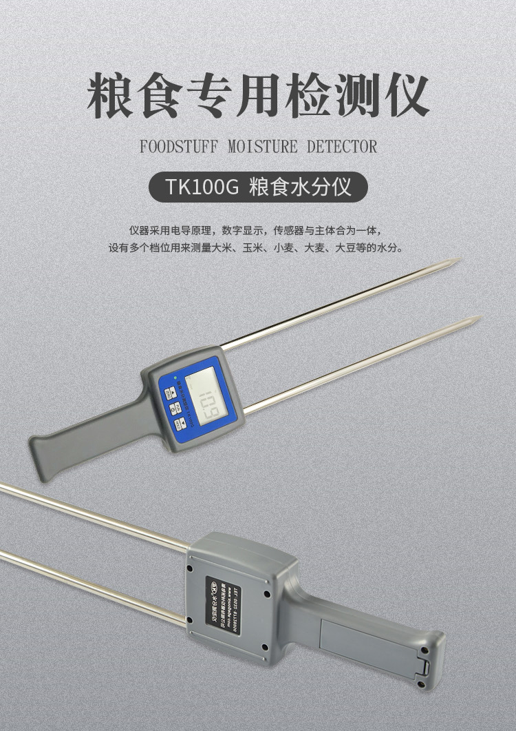 TK100G粮食水分仪是我公司研发生产的高性能、数字化水分测量仪器。仪器采用电导原理,数字显示,传感器与主体合为一体,设有多个档位用来测量大米、玉米、小麦、大麦、大豆等的水分。该仪器测量水分范围宽、精度高、显示清晰、测量迅速、性能稳定、指标可靠,而且体积小、重量轻,可随身携带在现场快速检测,使用简单方便。是食品、农业等行业检测其产品水分的理想仪器。