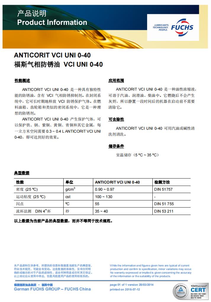 性能柢述 ANTICORIT VCI UNI 0-40是一种具有独特性 能的防锈油,含有VCI气相防锈抑制剂。在封闭系 统中.它可长时期标放VCI防锈保护气体。在燃 料油箱、齿轮箱和类似的密闭系统中,它是一种理 想的防锈剤。 ANTICORIT VCI UNI 0-40产生保护气体,可 以保护铁、钢、圆铜、黄铜、吉铜和其它金属,每 一立方米空间需要 0.3 - 0.4 L ANTICORIT VCI UNI (M0,即可达到好的效果。 |