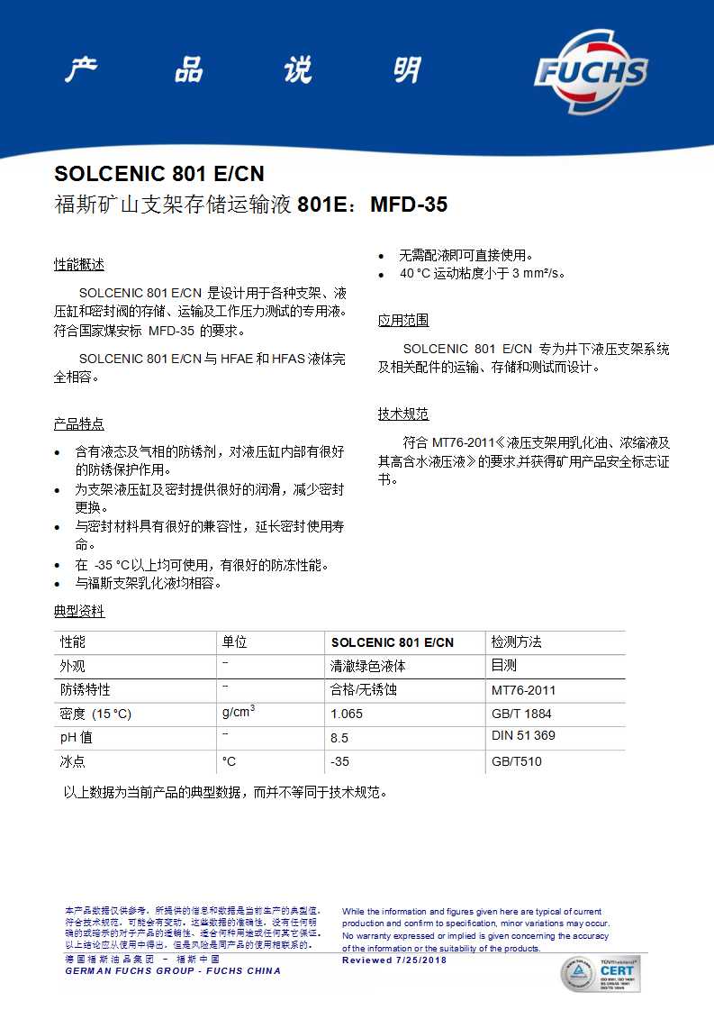 性能概述 SOLCENIC 801 E/CN是设计用于各种支架、液压缸,密封阀的存储、运输及工作压力测试的液。 符合煤安标MFD-35的要求。 SOLCENIC 801 E/CN 与 HFAE 和 HFAS 液体完 全相容。 |