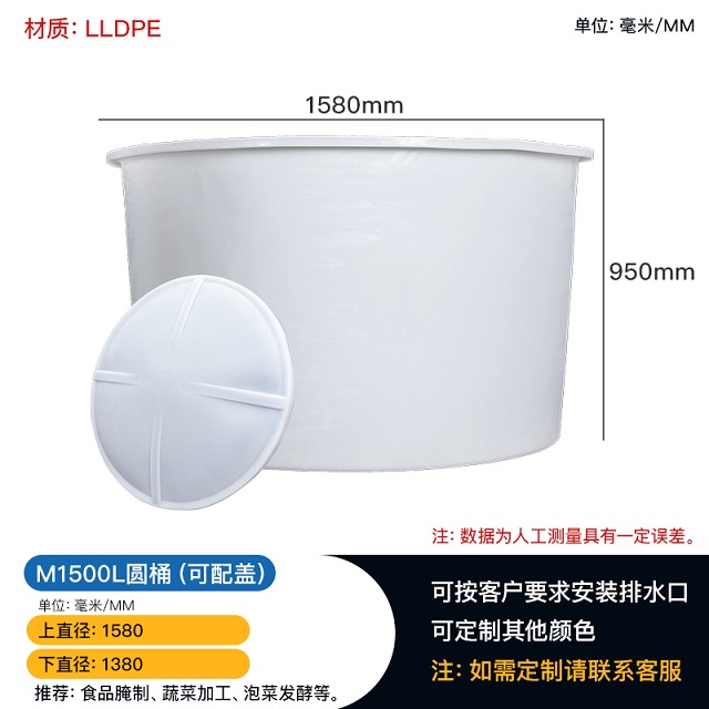 云南曲靖1500L塑料圆桶 食品级腌制桶漂染桶 敞口PE圆桶——塑料圆桶的材料多采用聚乙烯等塑料滚塑而成,塑胶制品化工、农药、医药、食品、五金电子、机电等行业液体、固体物品的外包装。