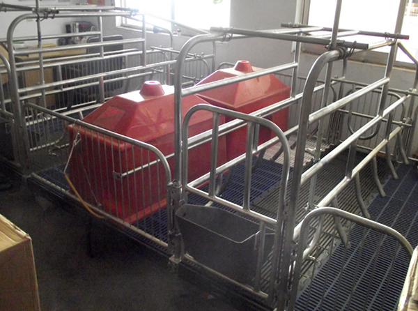 母猪产床,主体采用热浸锌管或喷漆管焊接,使其结构 合理,经济实惠,质量和寿命大幅提高,成为各大规模化养猪厂的 ,仔猪塑料地板,母猪球墨铸铁地板,扁钢大梁支撑。含母猪食槽,仔猪圆形补料槽,保温箱,电热板。