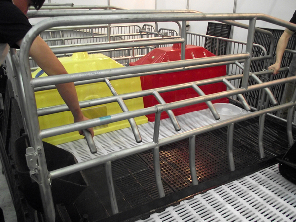母猪产床,主体采用热浸锌管或喷漆管焊接,使其结构 合理,经济实惠,质量和寿命大幅提高,成为各大规模化养猪厂的 ,仔猪塑料地板,母猪球墨铸铁地板,扁钢大梁支撑。含母猪食槽,仔猪圆形补料槽,保温箱,电热板。