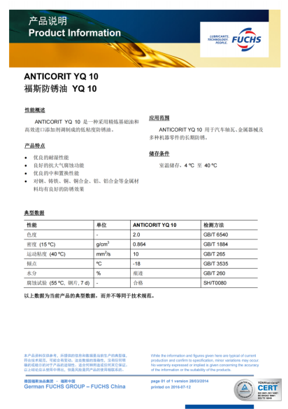 性能概述 ANTICORIT YQ 10是一种釆用精炼基础油和进口添加剂调制成的低粘度防锈油。 |