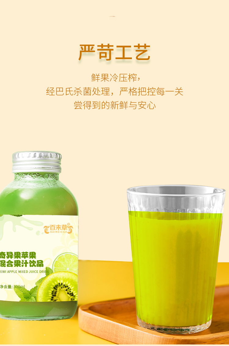 本品科学添加水、奇异果、苹果、白砂糖等为主要原料,采用现在生物技术精致而成的生物制品。