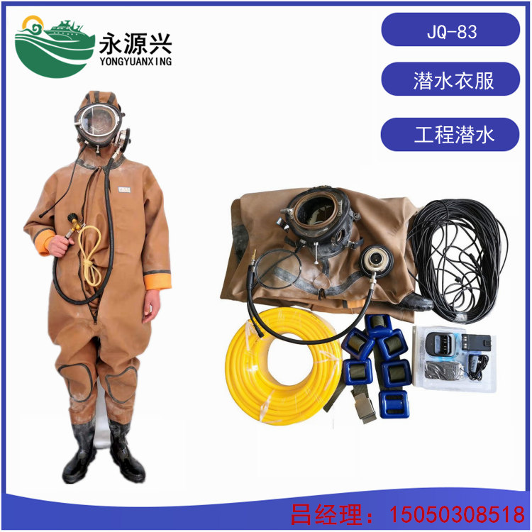 JQ83浅潜水服污水装具适用于市政清污工程、10米内浅潜水作业使用,此潜水服带有通话功能(头罩内附有耳机和送话器),面罩玻璃随时可拆卸,增加了潜水操作的。此装具使用组件:JQ83潜水服、60米潜水管、潜水通信电话(QDS9对进机1部、充电器1只、50米电线1根)、693供气调节器、12公斤配重腰带、潜水手电、手套、空压机(客户需要自购,套装中不含空压机)等。