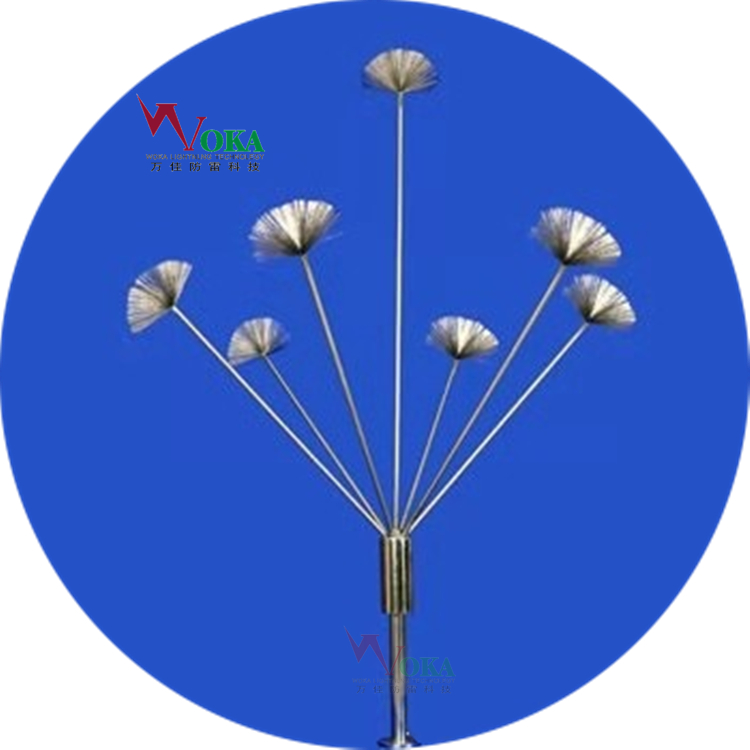 导体多短针雷电放散装置由大量不锈钢放散电组成,发射终端曲率半径小,它在积累电荷量很少时就会尖放电,放散电荷形成电晕,避免和延缓离子化通道形成,减少雷击机率。
