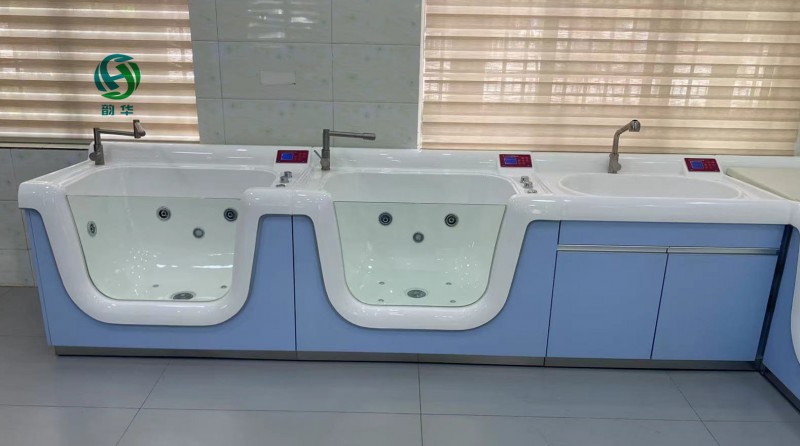婴儿洗浴中心拥有良好的台面质感,细腻亲切,无冰冷感,全弧形造型设计给婴儿体贴的呵护与关怀,洗礼池和游泳池特有的裙边设计,既方便固定一次性防交叉感染隔膜袋,又防止台面上污水流入池内。游泳池利用有效的水平面积提供更加理想的池内净深度,满足婴幼儿洗浴时的安全高度需要,同时有效保持水温特别设置水位线,防止婴儿游泳时池水外溢。