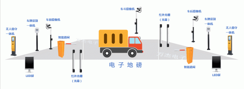 配置:电子地磅;无人值守识别一体机;LED大屏;无人值守一体机;智能道闸;