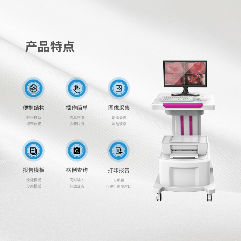 江苏娜缇莜生物科技有限公司研发生产的数码电子阴道镜,利用将子宫颈放大的彩色摄像仪,配合LED光源及滤镜,将图像送入主机,图像经过电路处理后,通过高分辨率显示器显示出清晰子宫颈的图像,供医师观察子宫颈上皮及血管的变化,籍以诊断是否有不正常的病变,同时判定病灶之严重程度。适用于女性子宫颈早期癌变和生殖道病变筛查与诊断。