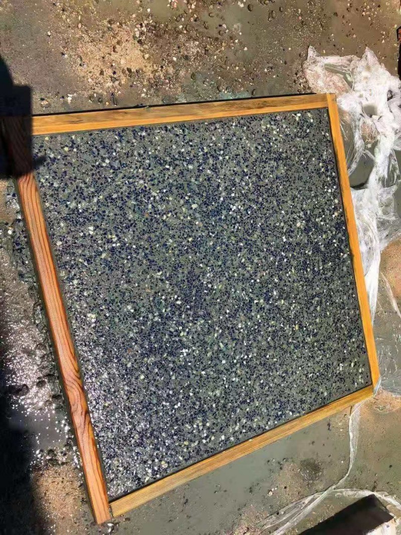彩色砾石聚合物混凝土压印是在混凝土搅拌时加入聚合物增效剂,优化砾石混凝土配合比,在聚合物混凝土提浆抹平或刮平表面,在聚合物混凝土表面撒播各种不同品种、不同规格的各种骨料, 在出现泌水时,使用长柄镘板或刮板抹子将表面抹至平坦及光滑。待聚合物混凝土有一定强度,对聚合物混凝土进行饰面洗刷,以或多或少或深或浅的 露出之前撒播的骨料,呈现现出各种场景的砾石景象,以达到预期的效果,聚合物砾石混凝土地坪。