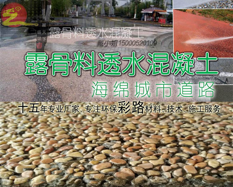 露骨料透水混凝土是一种装饰型透水混凝土,它的色彩和质感是由彩色骨料所决定。它的施工除须采用彩色强固透水混凝土施工工艺外,还需在刚刚施工完毕的湿态露骨料透水混凝土表面均匀喷洒(表面凝蚀剂)并在适宜的时间内用适当的水压进行水洗作业。
