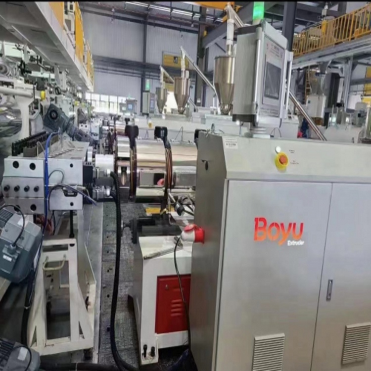 PVC石塑地板生产线设备由自动上料进入高速混料、再自动上料到双螺杆挤出机、由大板模具结构出料进行五辊定型模定型、排辊托冷装置、裁边装置、牵引机、自动切割机等组成。 机组结构紧凑,性能优良。螺杆、螺筒经优化设计,并采用高性能合金钢专项加工,使整机具有塑化均匀,挤出量稳定,产量高,寿命长等优点。主机螺筒采用铸铝加热器加温,风冷却,精密电控仪表控制温度。精密的定型压光装置,通过其良好的调整功能使板材定型优良。切割部分采用定长切割装置,保证板材长度正确。板材挤出设备有异向平行双螺杆挤出机,板材模具,真空定型和三轮牵引等辅机部分组成,应用前景十分广阔。PVC石塑地板材料以PVC塑料为主要原料,经特殊的发泡工艺制成,产品具有防潮、难燃(自熄)、不变型、美观、抗老化能力强等优点,并有耐腐蚀性,耐候防腐、防水、隔音、保温、绝缘等突出优点,可以根据用户要求,配制各种颜色,增加观赏性;使用寿命高达40-50年。加工及用途PVC石塑地板的加工十分方便,既可以像木材一样锯、刨、钻、钉、开孔、上螺丝、粘接,也可像一般塑料制品那样粘合胶接、焊接、热弯曲等加工。这使得它的应用范围非常广泛,完全可以代替木材、胶合板、刨花板在各种场合使用,是一种符合准则的新型装修装饰材料。我厂以严格的管理、丰富的经验、独到的工艺、合理的选材,竭诚为客户创造安全、健康、环保、人性化、高品质的产品,提供完善的售后服务,在短时间内为客户解决问题。您的满意是我们永远的追求。本公司专项生产PVC发泡地板机械设备,凡在我公司订购PVC石塑地板生产线设备:我们将对您进行全面的培训。熟练掌握设备操作技巧、正确分辨原材料质量及市场价格、根据客户需求确定配料比例的多少、以及地板厚度及颜色搭配比例。公司秉承 "顾客至上,锐意进取 "的经营理念,坚持 原则为广大客户提供优良的服务。欢迎惠顾!