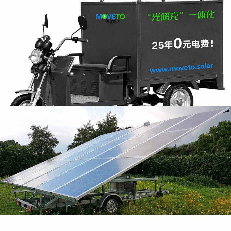 MoveTo.Solar 新能源移动储能供电系统是以模块化箱体做载体,以电动三轮车为运输工具,内置储能电池、储能变流器及监控系统,以实现电能随时、随地、随需运输、调度要求的可移动式供电系统(汽车用的“移动充电宝”)。