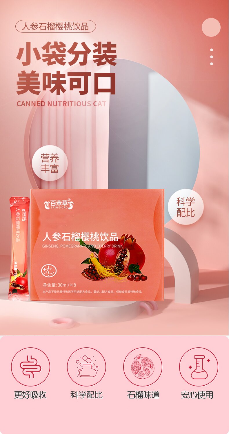 【配 料】水、低聚果糖、人参(五年及五年以下人工种植人参)、石榴、针叶樱桃果粉、Y-氨基丁酸、苹果酸