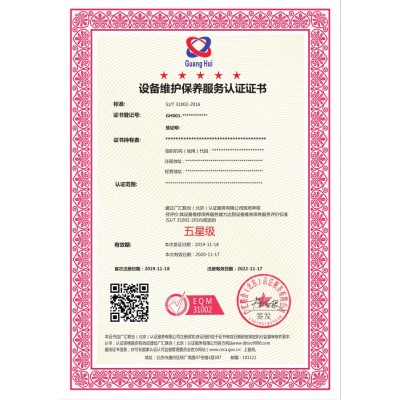 1、设备维修保养服务认证,设备维修保养服务认证证书,设备维修是指为保持、恢复以及提升设备技术状态进行的技术活动。