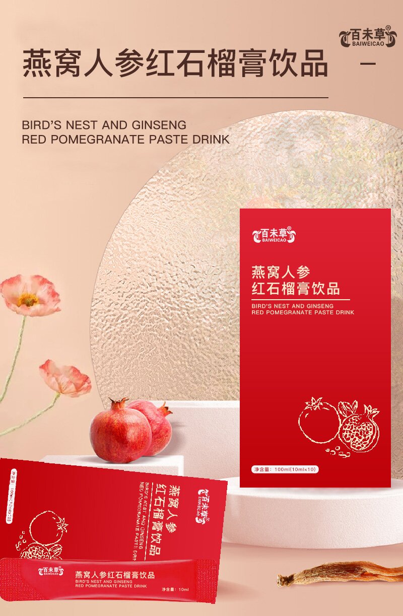 【产品名称】燕窝人参红石榴膏饮品【配料】水、低聚异麦芽糖液、红石榴、人参粉(5年及5年以下人工种植)、燕窝、赤藓糖醇、桑椹、魔芋粉、白芷