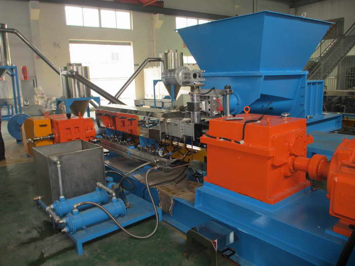 密炼机--自动提升机--推拉式锥双喂料机--双螺杆挤出机--单螺杆挤出机--液压板式自动换网--风冷模面热切造粒辅机--一级旋风分离器--二级旋风分离器----风冷振动筛(2.5m) --风吹料仓一套