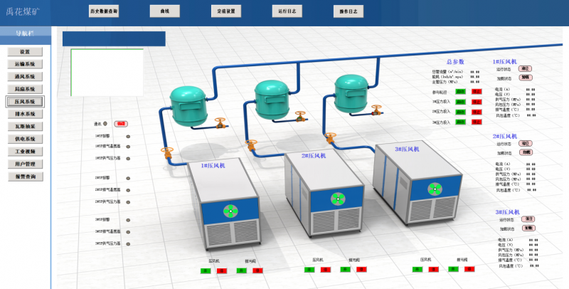 实时显示压风机和各种保护传感器的工作状态,显示压风机的故障类型以及分站之间的通信是否正常,对每个压风机的模拟参数进行实时曲线图的显示。根据矿井实际使用压风情况,自动实现压风机的开停控制。