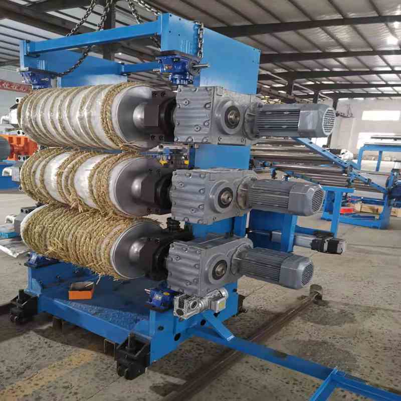 三、三辊压光机,三辊成型机,三辊机(规格)与机头的距离应尽可能靠近,一般为5-10厘米。三辊牵引速度比挤出线速度略快10--25%,可使皱纹消失并减少板材内应力。若三辊与机头距离太大,板易下垂发皱,光洁度不好,同时易散热冷却。