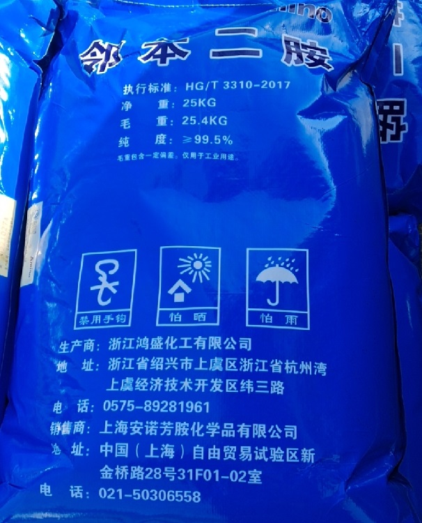 邻苯二胺是一个芳香胺,分子式为C6H4(NH2)2,无色单晶斜体,在空气和日光中颜色变深,以邻硝基苯胺为原料,用硫化钠还原法或催化加氢还原法制得邻苯二胺,作为农药中间体,染料中间体。