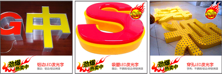 业务范围:led发光字平面发光字LED点阵发光字、LED冲孔发光字、树脂字、无边发光字、超级发光字、3D发光字、通体发光字、全彩发光字、高档炫彩发光字、迷你发光字、树脂发光字、特大铝板或其他金属板发光字、特大楼盘挂网发光字、LED亮化工程、金属精工字、金属烤漆字、水晶字及其他字;