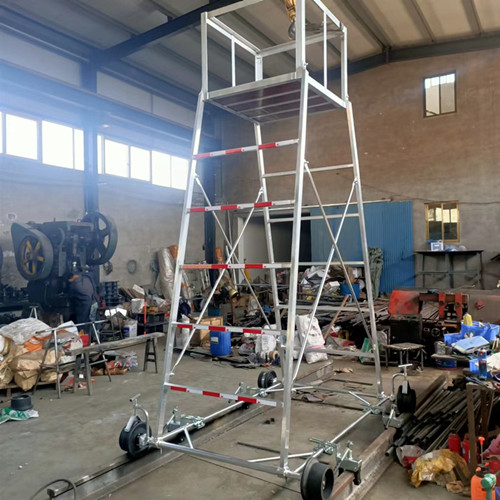 梯车(车梯)选用高强度铝合金材料制造,型材截面设计合理,重量轻,车梯底架用钢管制造,保证底架的稳定性和安全性,不变形。车轮为稀土尼龙轮强度高、运转无噪音、绝缘性能好,其中有一车轮镶嵌钢环,解决安全接地问题。