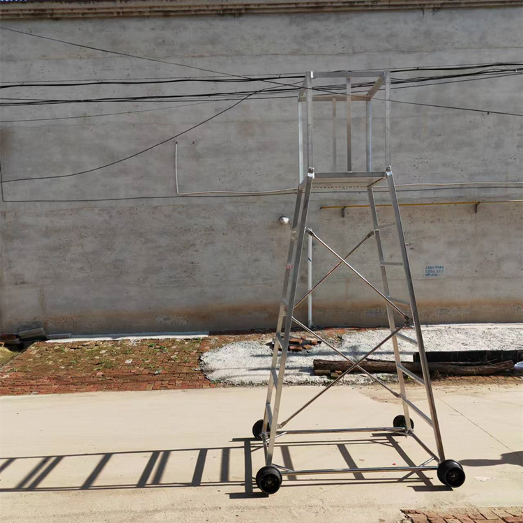 梯车(车梯)选用高强度铝合金材料制造,型材截面设计合理,重量轻,车梯底架用钢管制造,保证底架的稳定性和安全性,不变形。车轮为稀土尼龙轮强度高、运转无噪音、绝缘性能好,其中有一车轮镶嵌钢环,解决安全接地问题。