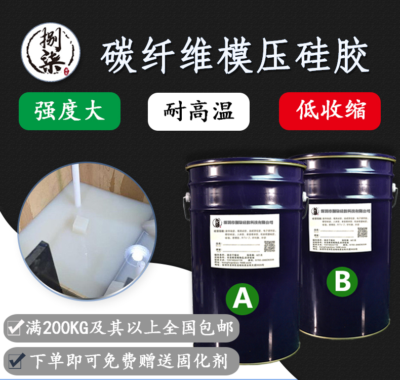 碳纤维模压硅胶介绍:此产品为双组份缩合型室温硫化液体硅胶,硅胶与固化剂配比为100:2,具有翻模次数多,耐撕拉耐酸碱耐高温等特点