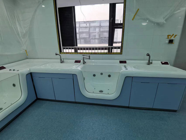 迪新婴儿洗浴中心拥有良好的台面质感,细腻亲切,无冰冷感,全弧形造型设计给婴儿体贴的呵护与关怀,洗礼池和游泳池特有的裙边设计,既方便固定一次性防交叉感染隔膜袋,又防止台面上污水流入池内。游泳池利用有效的水平面积提供更加理想的池内净深度,满足婴幼儿洗浴时的安全高度需要,同时有效保持水温特别设置水位线,防止婴儿游泳时池水外溢。