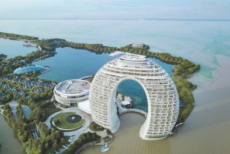 湖州月亮湾n型建筑是一款大型镂空灯光雕塑,白天是一个地区的建筑标识,晚上灯光变幻,灯光照影在旁边的湖水里,湖水微动灯影晃动,变幻出不同的图形。成了一道美丽的风景,吸引更多的游人驻足观望,是人们夜晚打卡拍照的胜地。