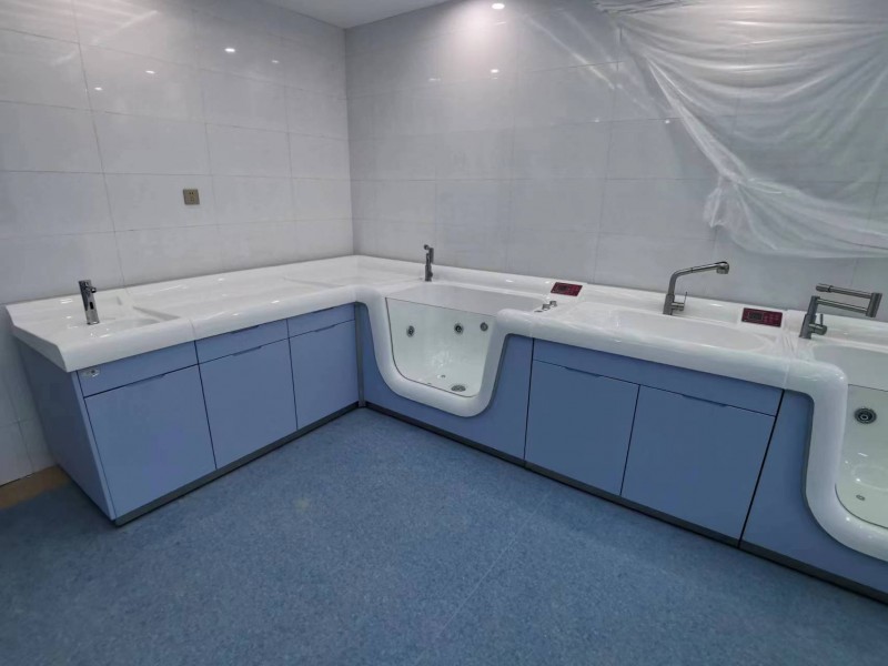 新瑞婴儿洗浴中心拥有良好的台面质感,细腻亲切,无冰冷感,全弧形造型设计给婴儿体贴的呵护与关怀,洗礼池和游泳池特有的裙边设计,既方便固定一次性防交叉感染隔膜袋,又防止台面上污水流入池内。游泳池利用有效的水平面积提供更加理想的池内净深度,满足婴幼儿洗浴时的安全高度需要,同时有效保持水温特别设置水位线,防止婴儿游泳时池水外溢。产品配置:台面、微电脑控制系统、恒温控制系统、时间监控报警、给排水系统及电源、防水柜门及柜体、水处理(非标配,供选择)、USB多媒体播放器(非标配,选配)
