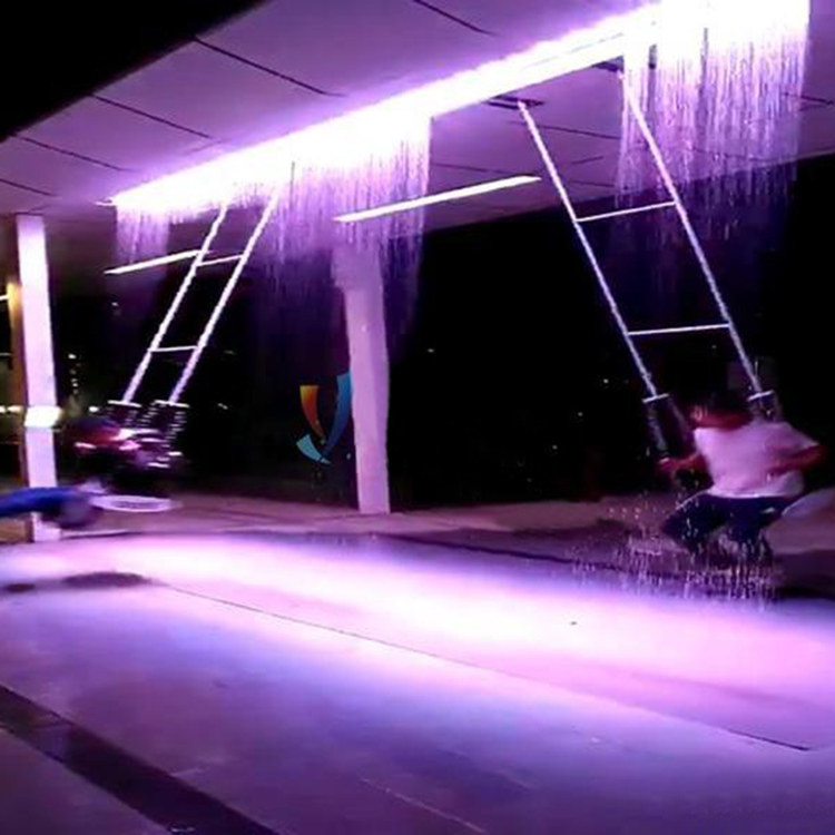 水幕秋千的设计原理是在数字水帘功能上的运用机械及控制原理,使秋千的摆动信号自行传送到秋千控制系统。秋千控制系统通过检测的摆幅周期和速度来计算控制雨帘的电磁阀,通过传感器采集和计算乘坐秋千者的速度和角度,预测乘坐者的行为,进而准确控制喷水管的开关,让乘坐秋千的游客通过水幕而不会被淋湿衣服。一切的游乐设备均是由自己的出产车间规划出产的,不用担心质量的问题。清凉的秋千,荡秋千很惬意,可还有人嫌它不够诗意,硬是将瀑布也塞进了秋千里。利用秋千和机械装置的互动,秋千上的人既可以感受到瀑布的清凉,荡漾的欢乐,更可以体会“人在雨中行,滴水不沾身”的绝妙。