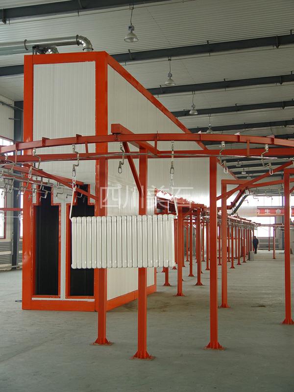 喷漆线:上喷淋前处理烘干脱水冷却—底漆—流平—面漆—流平—烘干(30min、80℃)—冷却—下件