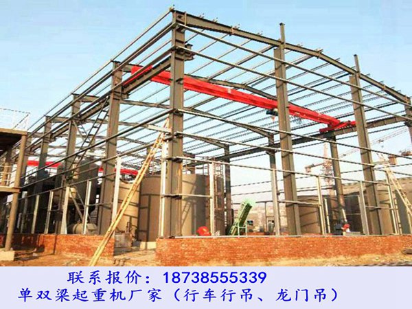 宁夏吴忠单梁桥式起重机生产厂家制造的桥式起重机的型号有单梁起重机和双梁起重机,单梁行吊的构造相对于双梁来说简单一些,同时也能够节省一些制造上的材料成本和运行工作时候的空间成本。