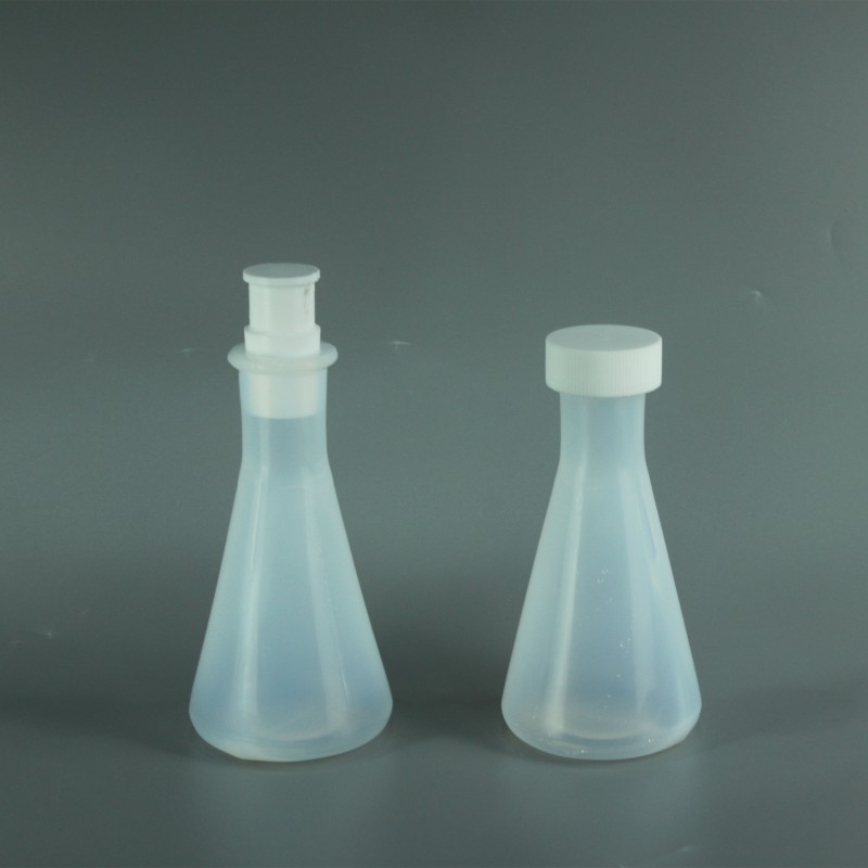 PFA三角烧瓶也称锥形瓶(也有PP等其他材质,使用相对较少),由特氟龙PFA材质制成,纵剖面呈三角形状的滴定反应器,一种化学实验室常见的PFA器皿。一般使用于滴定实验。为防止滴定液下滴时溅出,造成实验误差,将瓶子放磁搅拌器上。可用于普通实验,制取气体或作为反应容器。其锥形结构相对稳定,不易倾倒。比重大,并具有耐热性,因此可没入到水浴器或油浴器里进行加热。另外采用平底,稳定性好。由于是三角烧瓶,不需要烧瓶架也是一个优点。