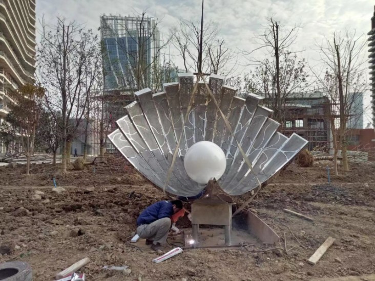 城市景观雕塑 镜面不锈钢雕塑 珍珠宝扇雕塑安装图镜面抛光效果分为预抛光和精抛光两部分:预抛光是先用硬性或较硬的抛光轮对经过磨光的不锈钢镂空球表面进行表面处理。精抛光部分是用软性轮对预抛光表面做进一步加工,除去预抛光留下的痕迹,使不锈钢获得光亮如镜的表面效果。